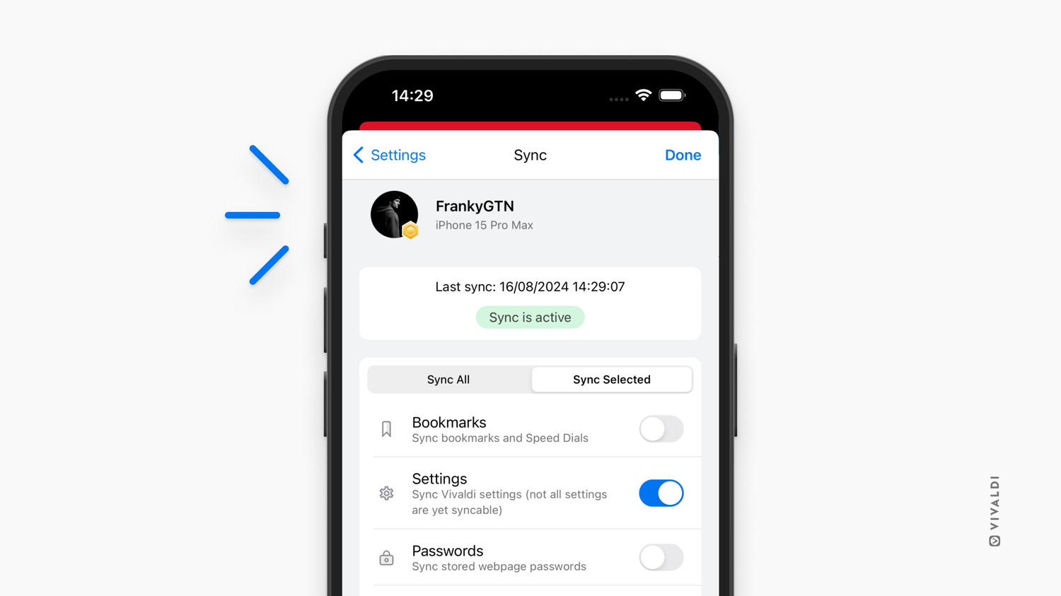 Если вы делали донат в поддержку Vivaldi, то теперь значок поддерживающего проект отображается в настройках синхронизации. Это способ поблагодарить пользователей за вклад. Значок будет показываться его каждый раз, когда вы заходите в настройки синхронизации на своем мобильном устройстве.