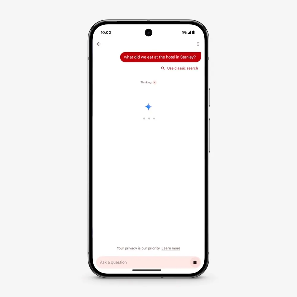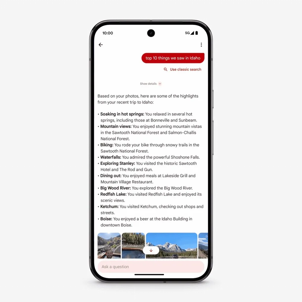 Ask Photos — это новая поисковая функция, основанная на моделях Gemini, которая использует возможности естественного языка для анализа вашей фотогалереи. Она понимает контекст ваших фотографий, таких как важные для вас люди, хобби или любимые блюда, и помогает находить воспоминания, скрытые детали и информацию о вашей жизни.