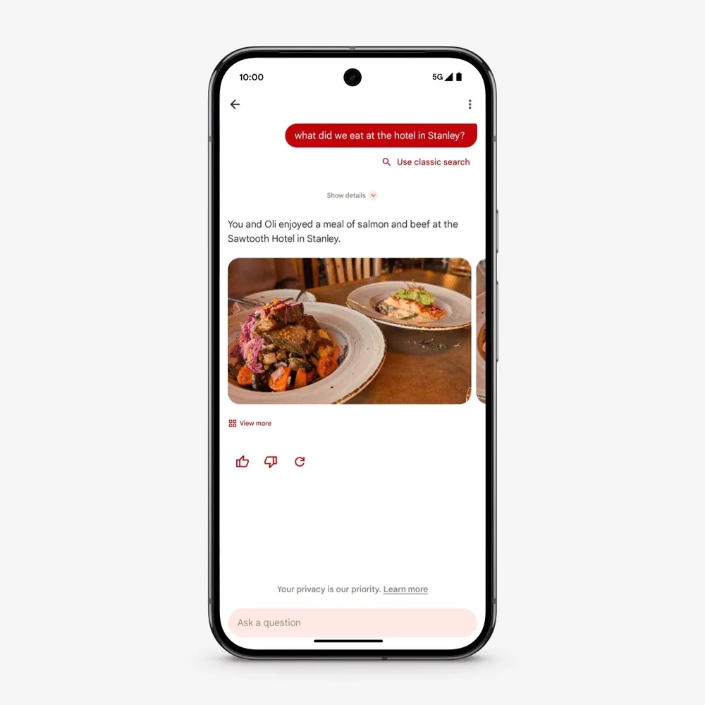 Функция Ask Photos может распознать детали на ваших фотографиях, такие как место, где вы использовали туристическое снаряжение, или блюдо на столе в ресторане, и предоставить точный ответ.