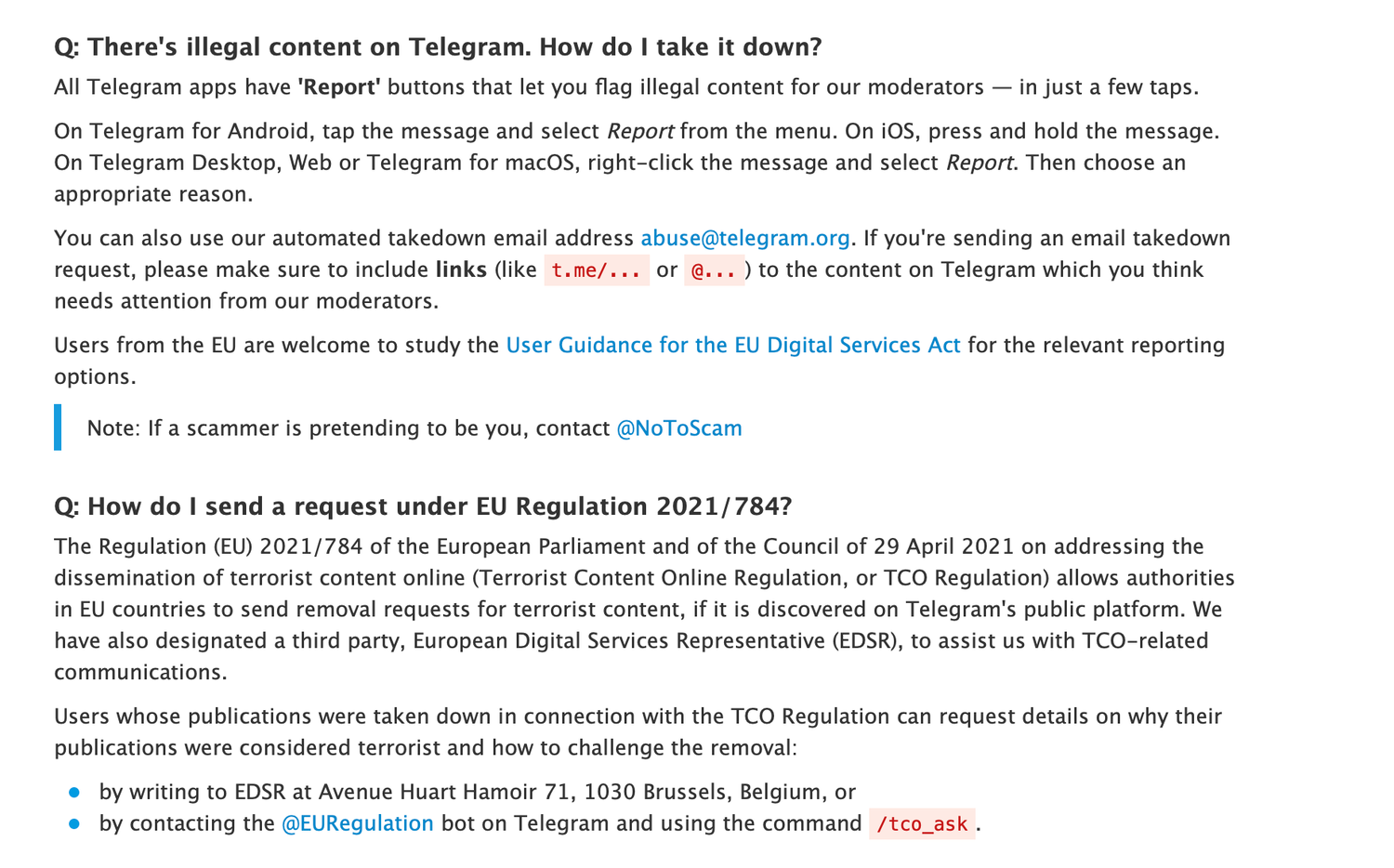 Telegram уже обновил политику модерации контента. Теперь пользователи могут напрямую жаловаться модераторам на противоправный контент, включая чаты и частные группы. Это обновление появилось в разделе часто задаваемых вопросов (FAQ) на сайте мессенджера. Ранее политика Telegram утверждала, что администрация не обрабатывает запросы, связанные с частными чатами. Теперь же во всех приложениях Telegram появилась кнопка Report («пожаловаться»), которая позволяет пользователям быстро сообщить о незаконном контенте.