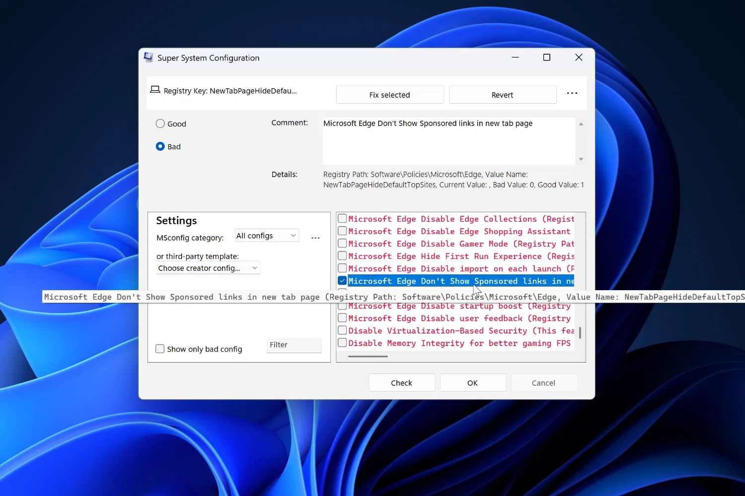 Плохие записи отображаются красным цветом. Вы можете выбрать опцию «показывать только плохую конфигурацию», чтобы скрыть хорошие настройки и сосредоточиться на том, что программа считает плохим.