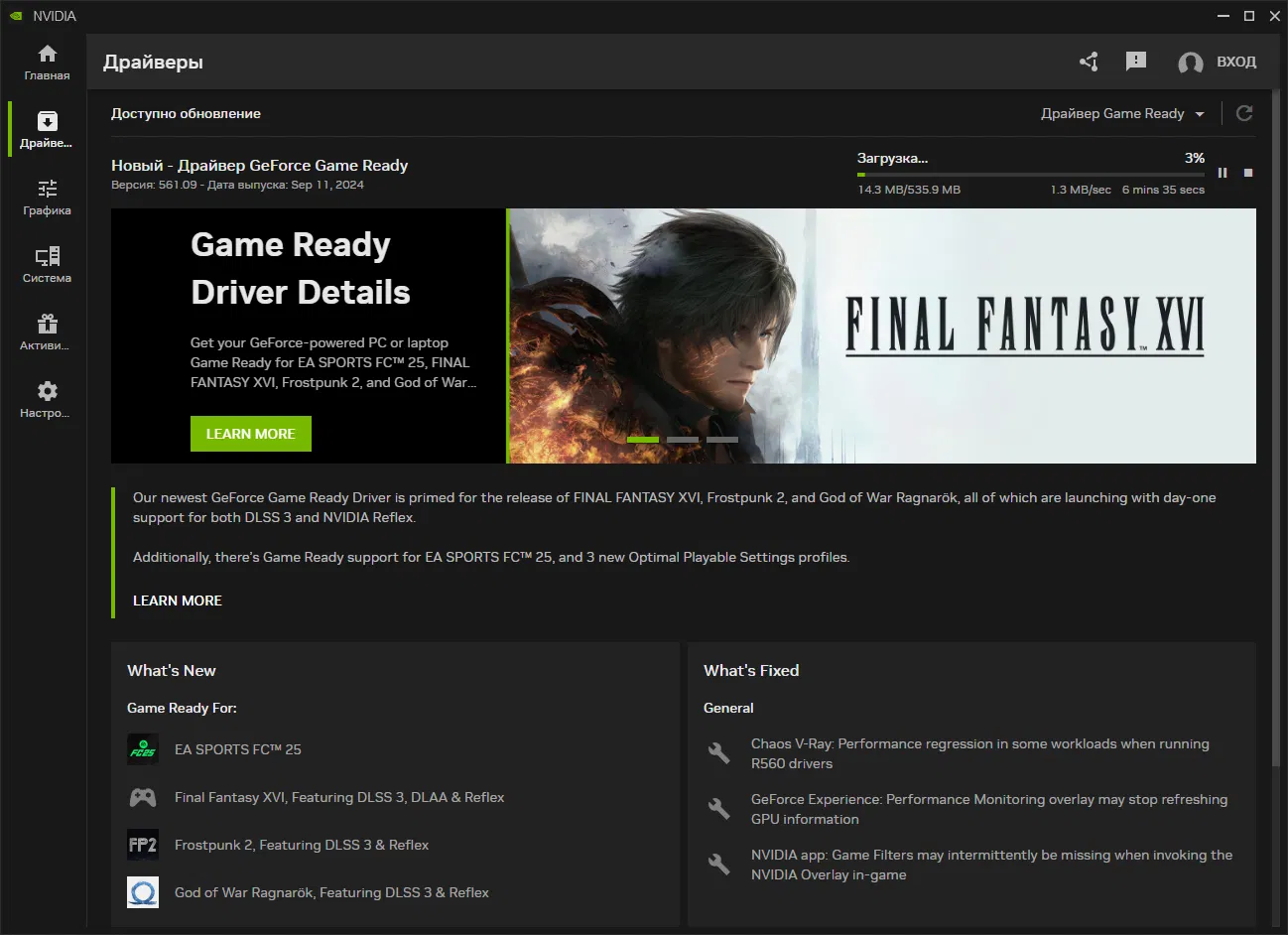 В обновлении драйвера NVIDIA GeForce Game Ready 561.09 WHQL, представленном 11 сентября 2024 года, добавлена поддержка для нескольких крупных игровых релизов, включая FINAL FANTASY XVI, Frostpunk 2 и God of War Ragnarok. Все эти игры получили поддержку технологий DLSS 3 и NVIDIA Reflex с первого дня выпуска.
