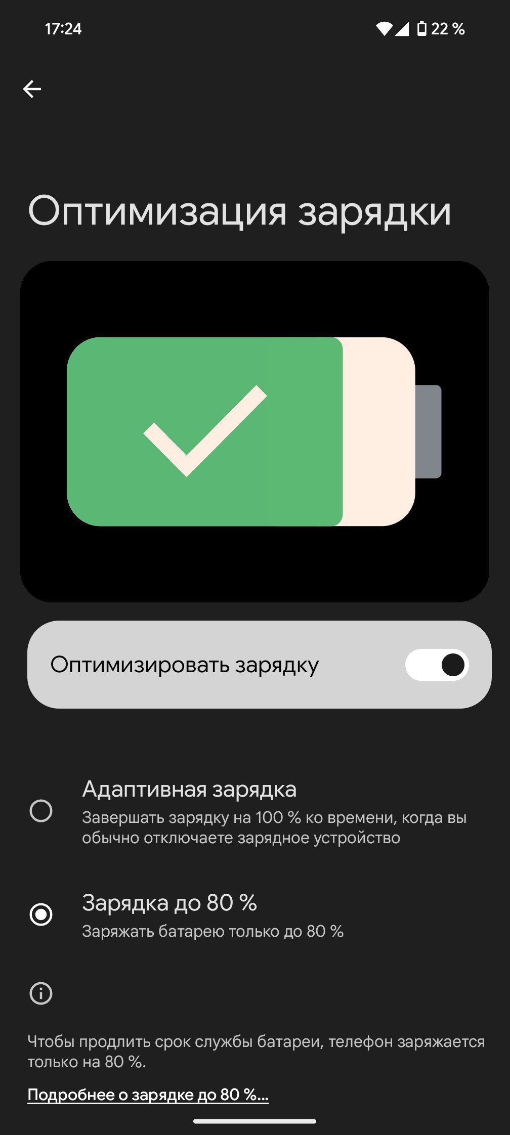 Теперь в настройках устройств Pixel появился новый раздел — «Оптимизация зарядки» (Настройки > Батарея). Помимо адаптивной зарядки, которая приостанавливает процесс зарядки на уровне 80% и завершает его непосредственно перед тем, как пользователь планирует отключить устройство, добавлен новый режим — «Ограничить до 80%». При активации этой опции смартфон будет заряжаться только до 80%, что позволит снизить нагрузку на батарею и тем самым продлить её срок службы.