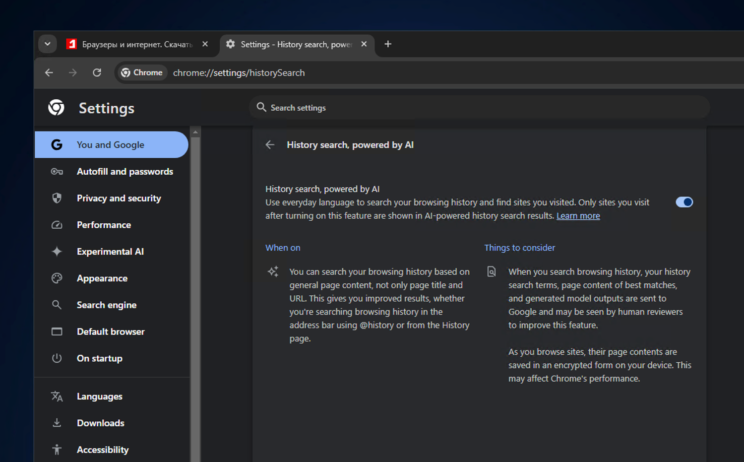 На данный момент функция доступна только в США, а язык Chrome должен быть установлен на английский. Чтобы включить функцию, перейдите в Settings > Experimental AI > History search, powered by AI (Настройки > Экспериментальные ИИ-функции > Поиск в истории браузера с помощью ИИ). Вы можете отключить функцию в любой момент.