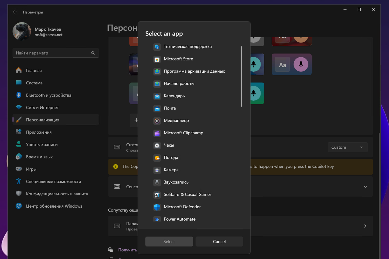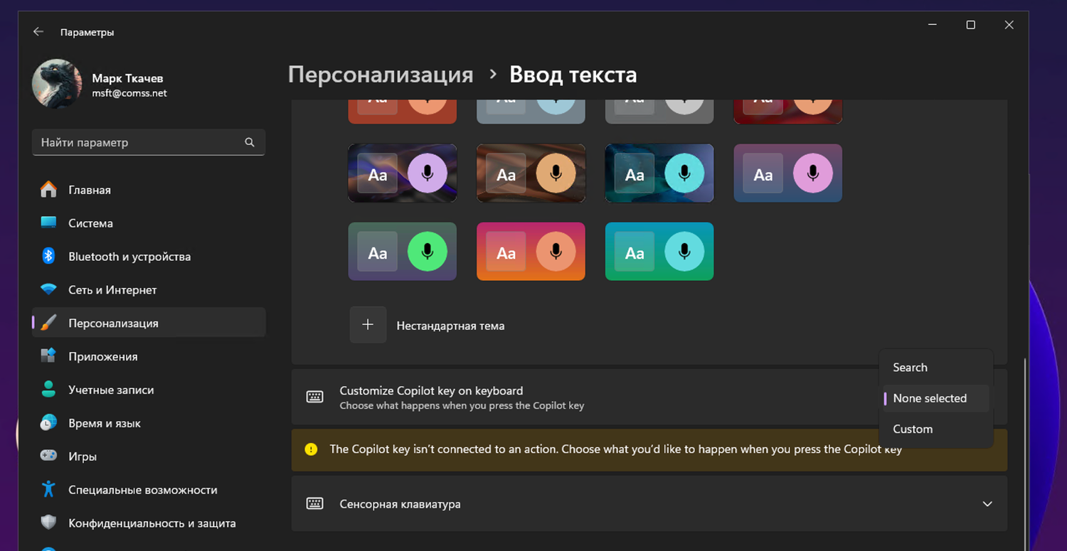 - Добавлена возможность настроить клавишу Copilot. Теперь вы можете выбрать приложение в формате MSIX, подписанное и соответствующее требованиям безопасности и конфиденциальности, для запуска с помощью этой клавиши. Клавиша будет по-прежнему запускать Copilot на устройствах, где установлено приложение Copilot, пока пользователь не выберет другую опцию. Этот параметр доступен через Параметры > Персонализация > Ввод текста. Если клавиатура, подключенная к вашему ПК, не имеет клавиши Copilot, изменение этого параметра не приведет к действиям.