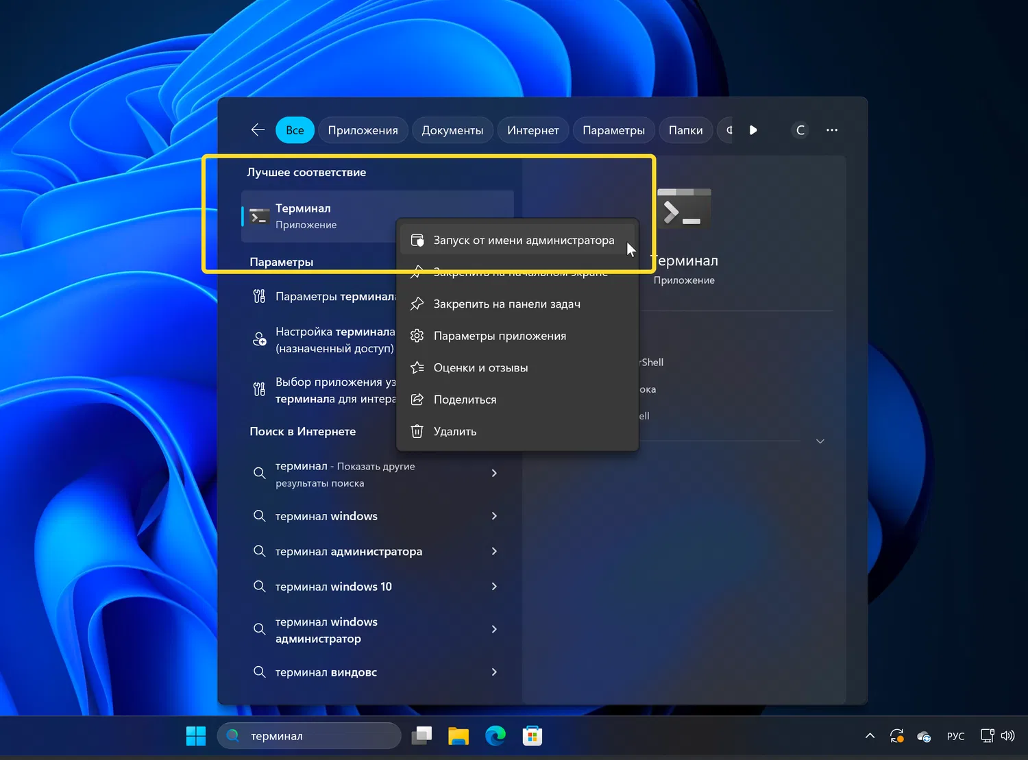 Windows Terminal поддерживает все команды командной строки, и его можно запустить через меню Пуск: