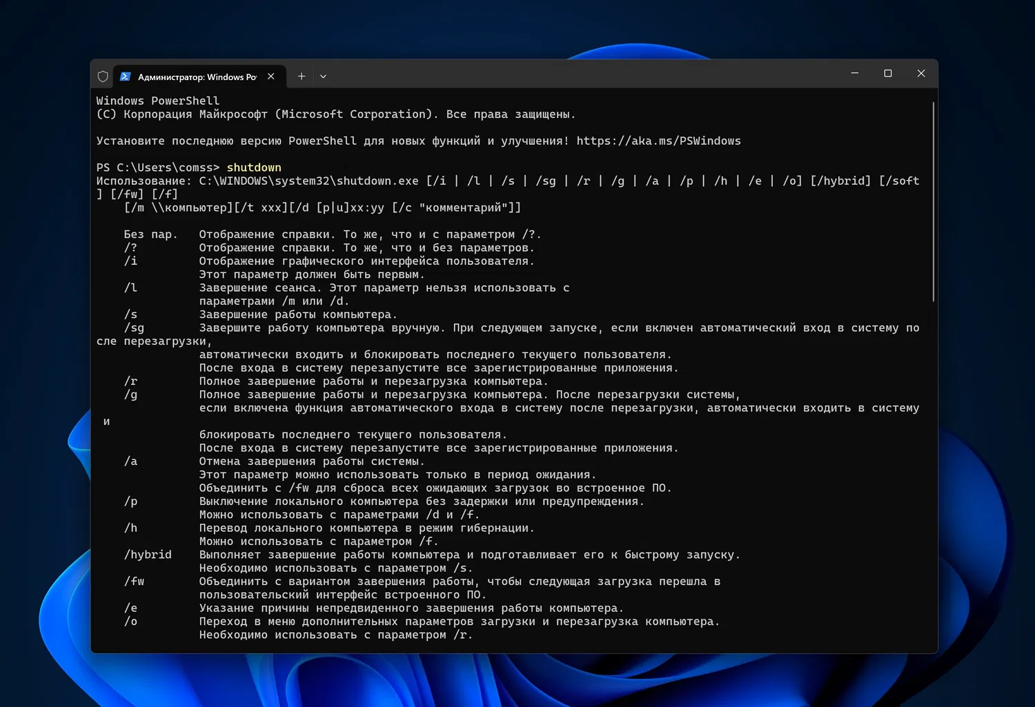 Другой полезный вариант — shutdown -r -o, который перезапускает компьютер и открывает меню дополнительных параметров запуска, полезное для устранения неполадок. Введите просто shutdown, чтобы увидеть другие опции.