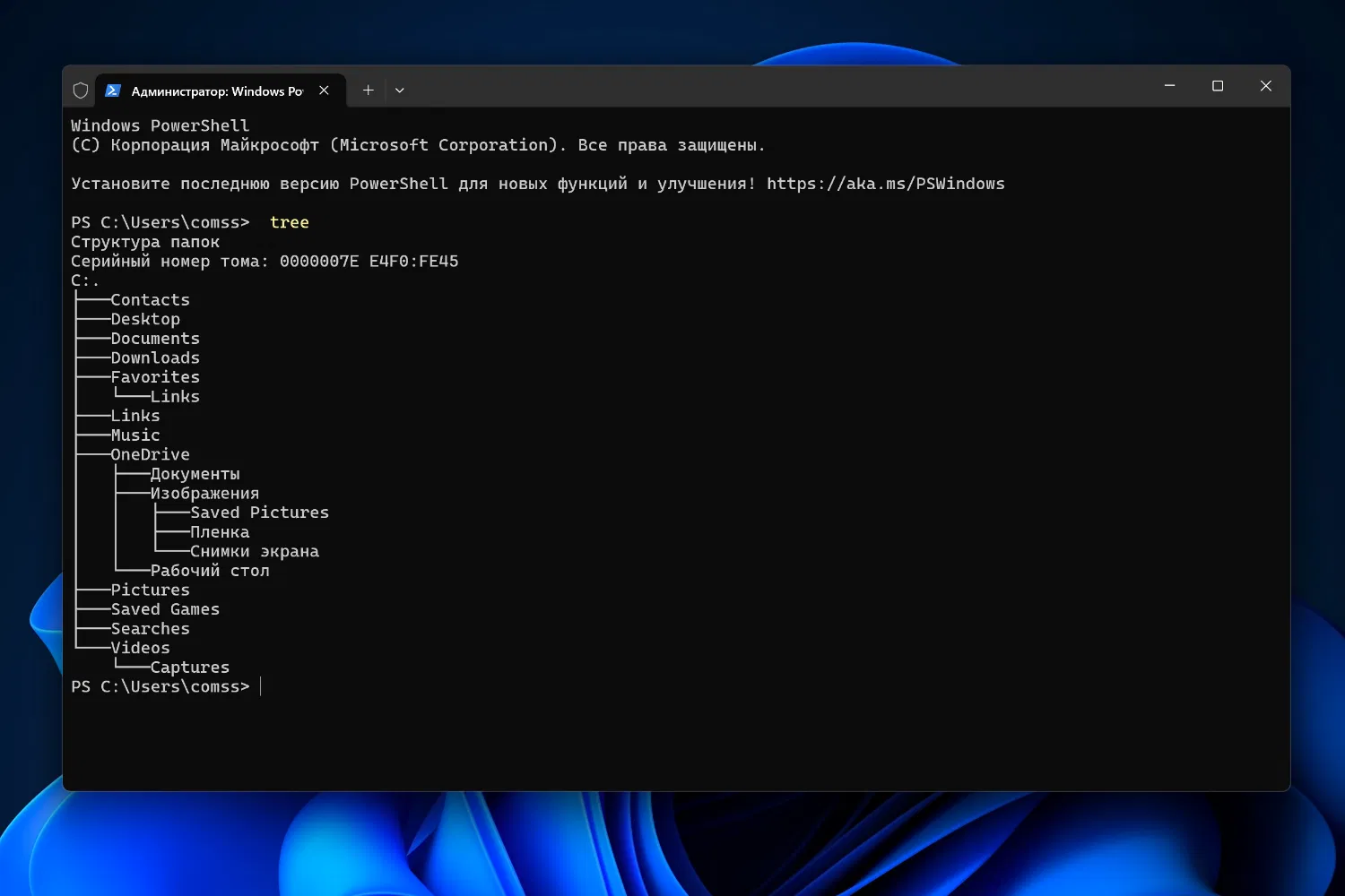 Команда tree отображает древовидную структуру папок на вашем компьютере. Вы можете указать путь к конкретной директории (например, **C:\Programs**) и добавить флаг /f, чтобы также увидеть файлы в папках.