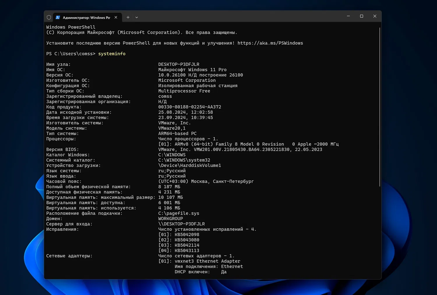 Команда systeminfo предоставляет всю информацию о вашей системе: версия Windows 11, модель процессора, объем оперативной памяти и хранилища, активные сетевые подключения и даже время загрузки последнего сеанса.