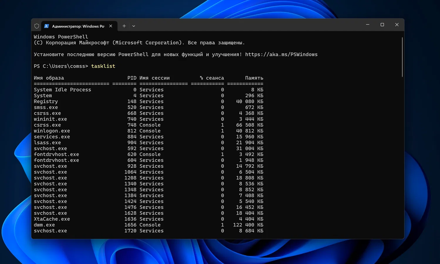 Команда tasklist показывает список всех запущенных приложений и их идентификаторы процесса (PID), также как и Диспетчер задач. С помощью taskkill /pid