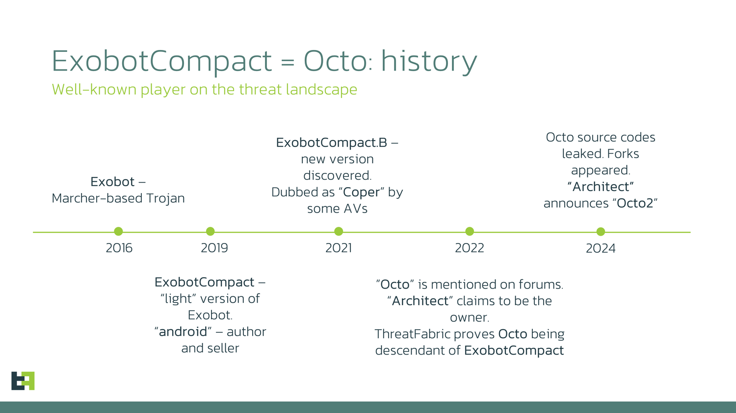 Octo представляет собой Android-троян для банковских систем, эволюционировавший из ExoCompact (2019-2021), который, в свою очередь, базировался на трояне ExoBot, запущенном в 2016 году. Исходный код ExoBot был слит в сеть летом 2018 года.