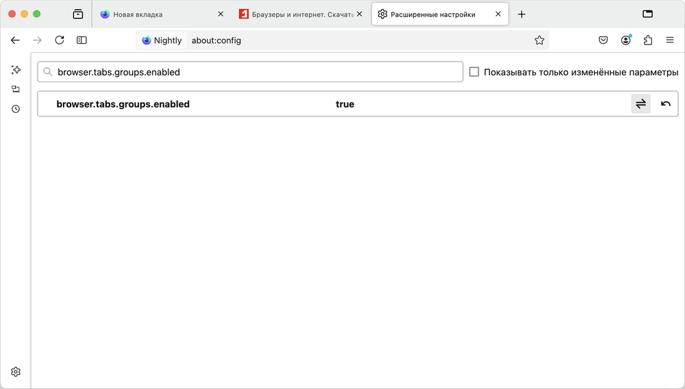 about:configв адресную строку браузера. Подтвердите, что принимаете риск. - Найдите browser.tabs.groups.enabled