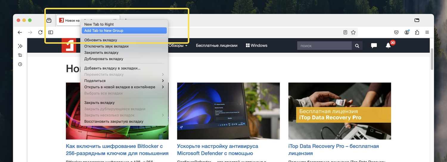 Щелкните правой кнопкой мыши на вкладку и выберите Add tab to new group (опция пока не локализована), чтобы создать новую группу вкладок в Firefox. Вы уже можете перетаскивать вкладки между группами. Некоторые функции, такие как сворачивание и разворачивание групп, пока не реализованы.