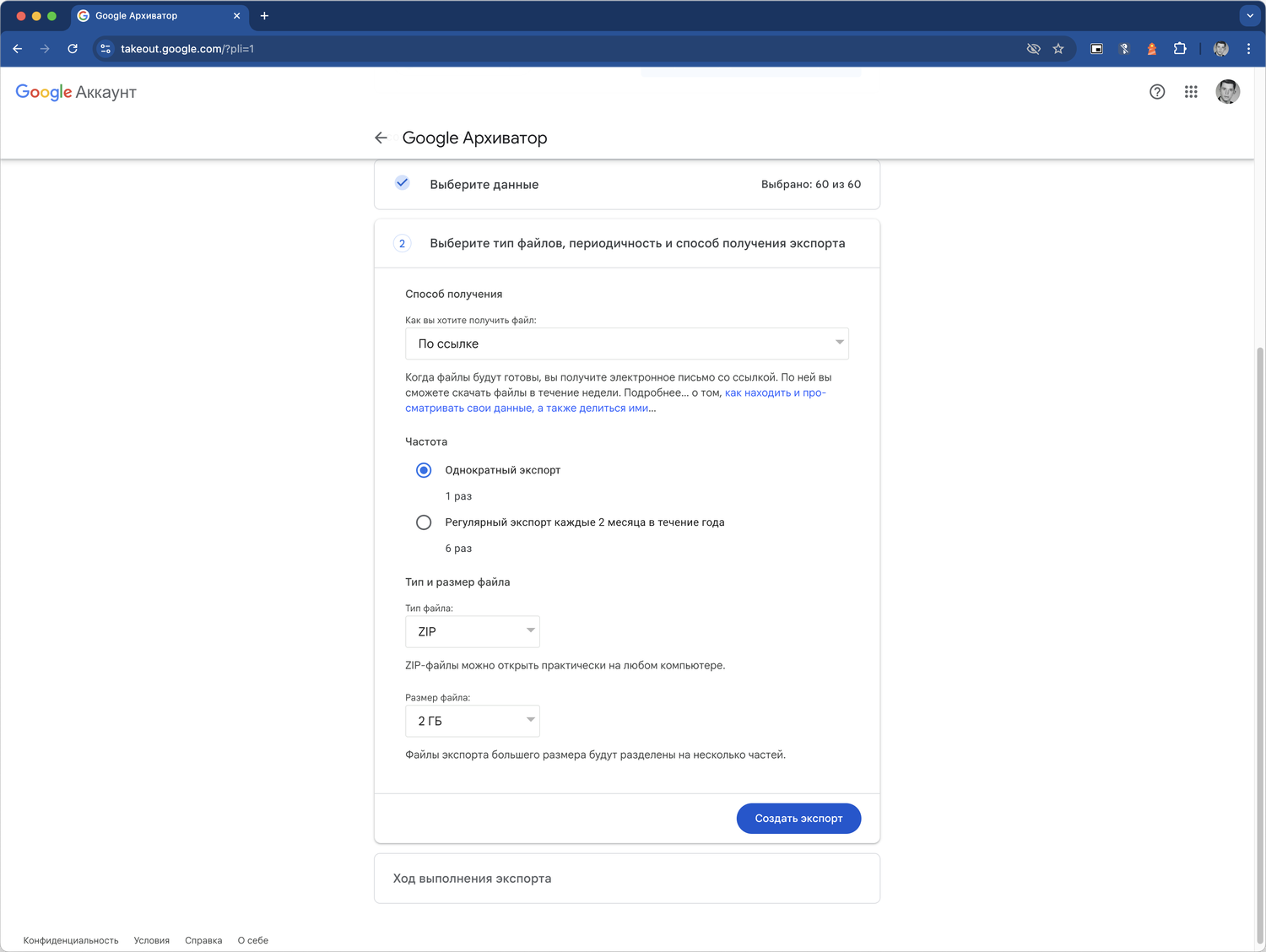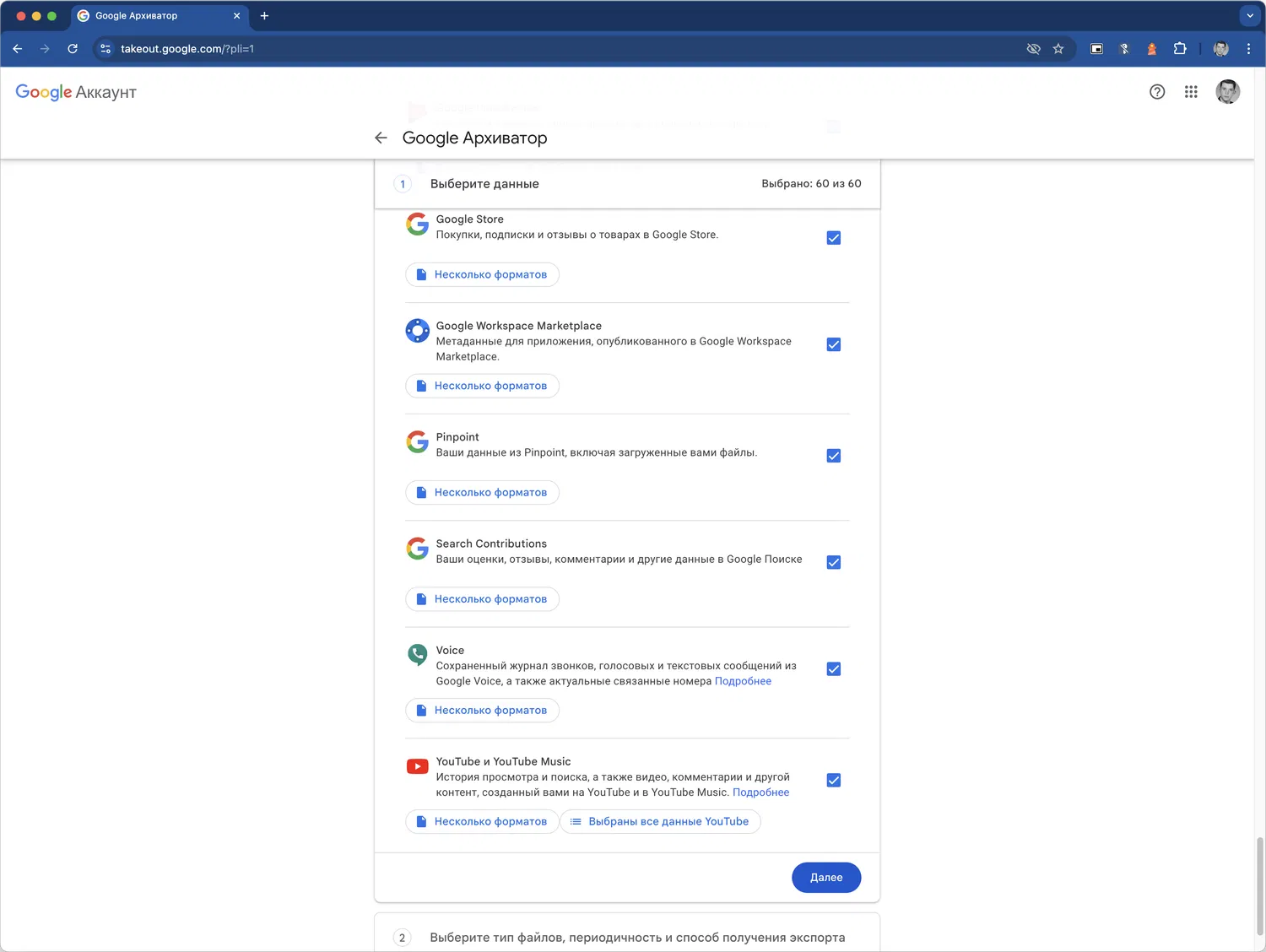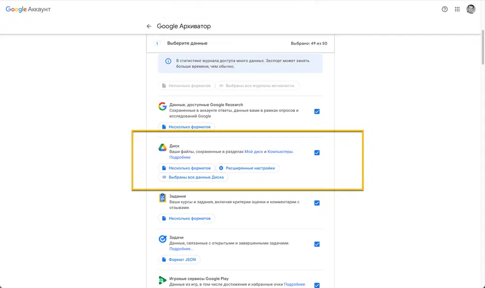 - Данные журнала доступа — журналы активности в аккаунте, которые могут занять больше времени на экспорт.