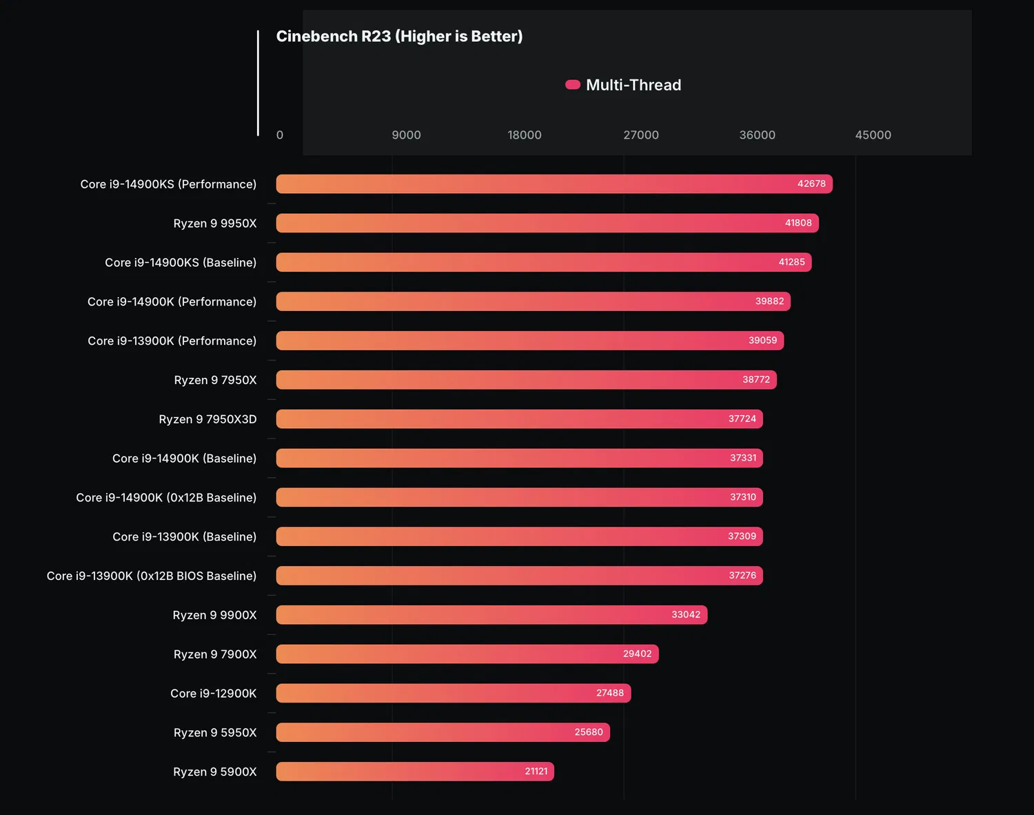 На графике ниже видно сравнение с процессорами AMD Ryzen, где процессор Core i9-13900K с патчем 0x12B теперь отстает даже от Ryzen 9 7950X, который обычно набирает около 37 500 баллов.