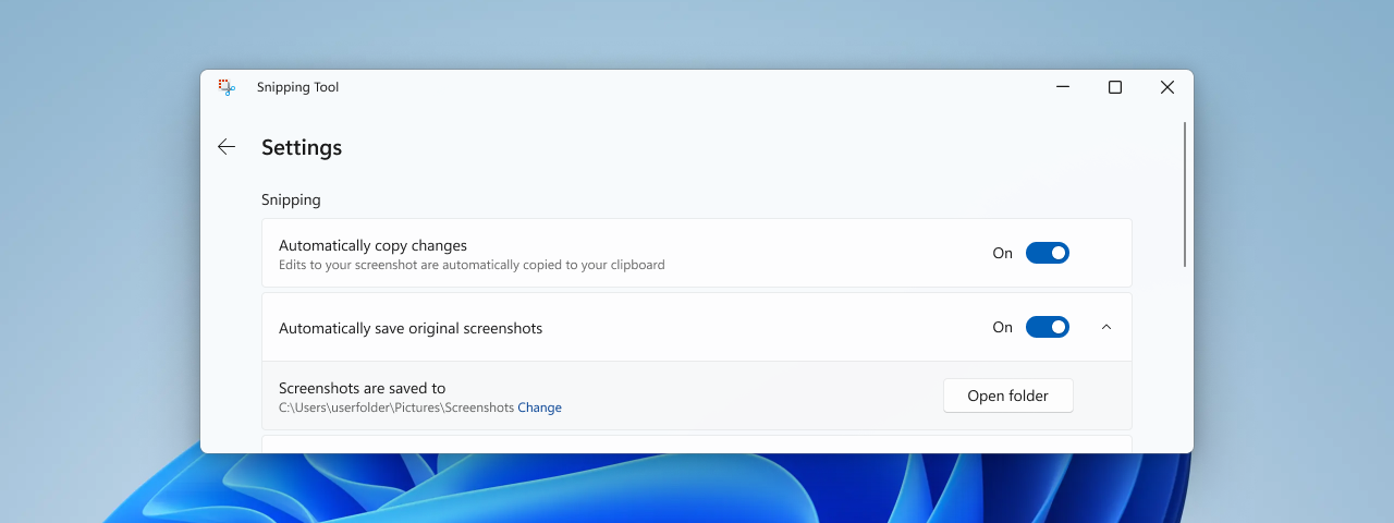 Выпущено обновление для инструмента "Ножницы" (версия 11.2408.15.0 и новее) для участников программы Windows Insider на каналах Beta и Release Preview, которое добавляет возможность изменять папку, в которую по умолчанию сохраняются снимки экрана и записи экрана. Чтобы опробовать эту функцию, необходимо перейти в параметры приложения "Ножницы" и выбрать новую папку по умолчанию.