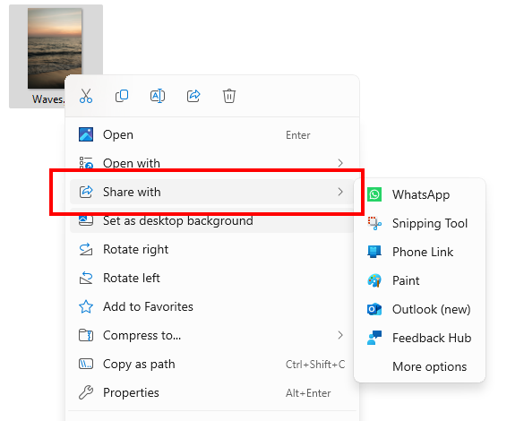 - Добавлена возможность делиться файлами напрямую через приложения, поддерживающие обмен в Windows, при щелчке правой кнопкой мыши на локальных файлах в Проводнике или на рабочем столе.