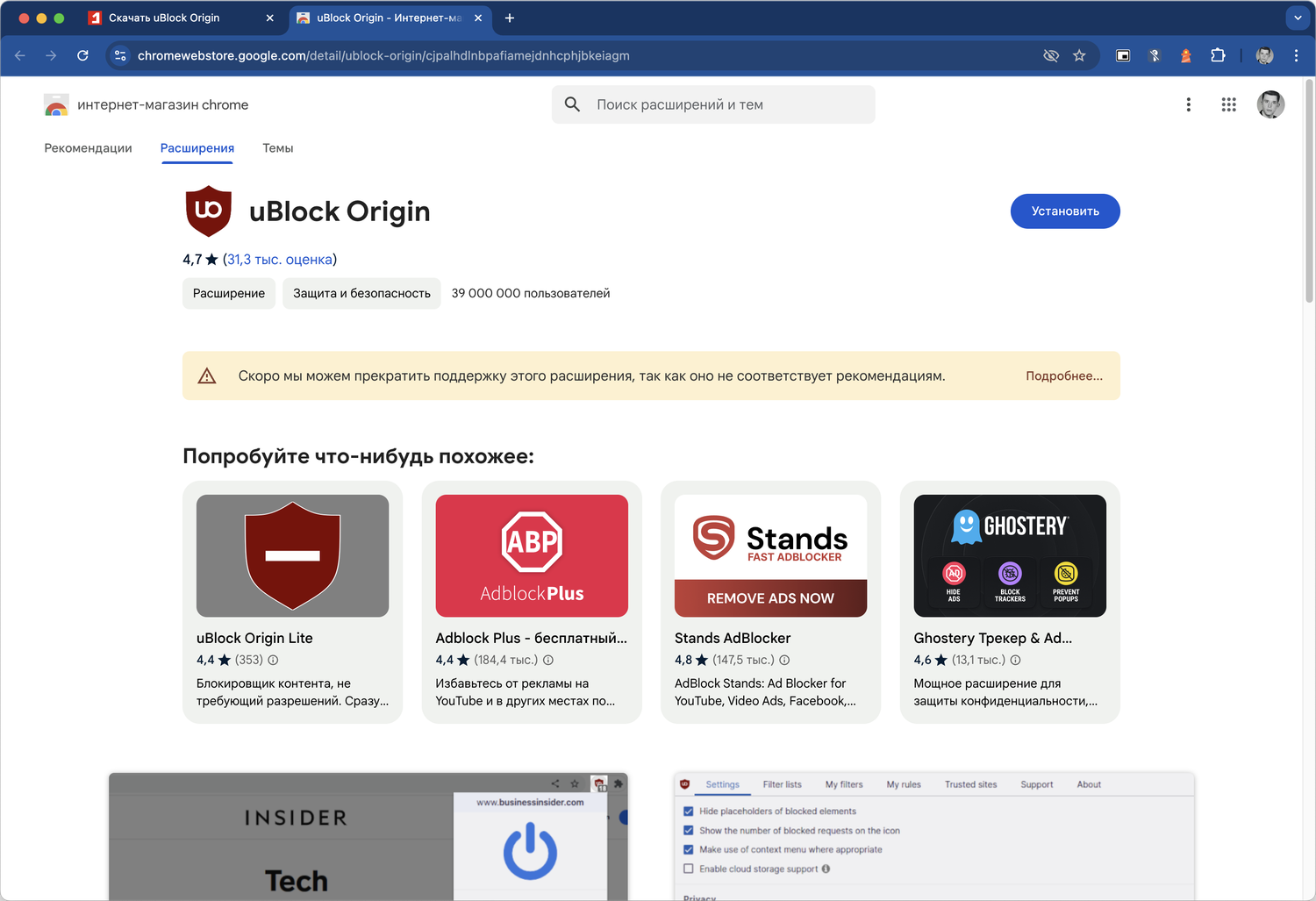 Ранее мы уже писали о планах Google отключить поддержку Manifest V2, и теперь предупреждения о необходимости перехода на новые расширения стали появляться прямо в Chrome Web Store. На странице uBlock Origin пользователи видят сообщение с предложением установить другие блокировщики рекламы: