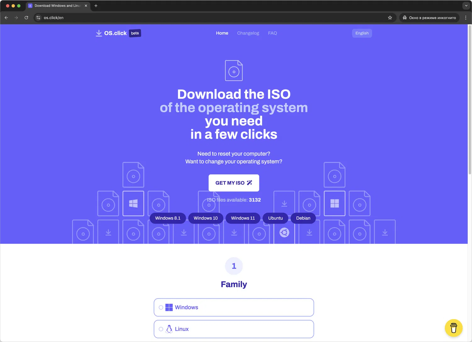 Для начала перейдите на сайт os.click. Вы увидите на главной странице список поддерживаемых операционных систем. Нажмите GET MY ISO, выберите раздел Windows и затем нажмите на Windows 11.