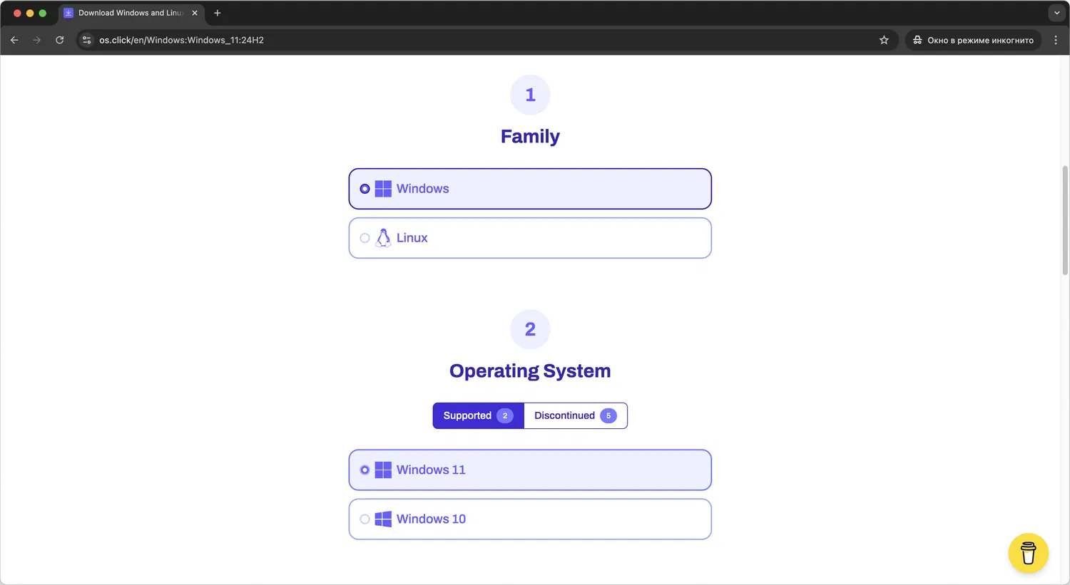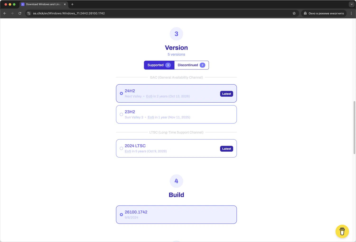 Вы можете выбрать как новейшие версии (вкладка Supported), так и старые версии Windows (вкладка Discontinued) для загрузки ISO-образов, например, Windows 11 LTSC 2024, а также другие версии Windows и Linux.