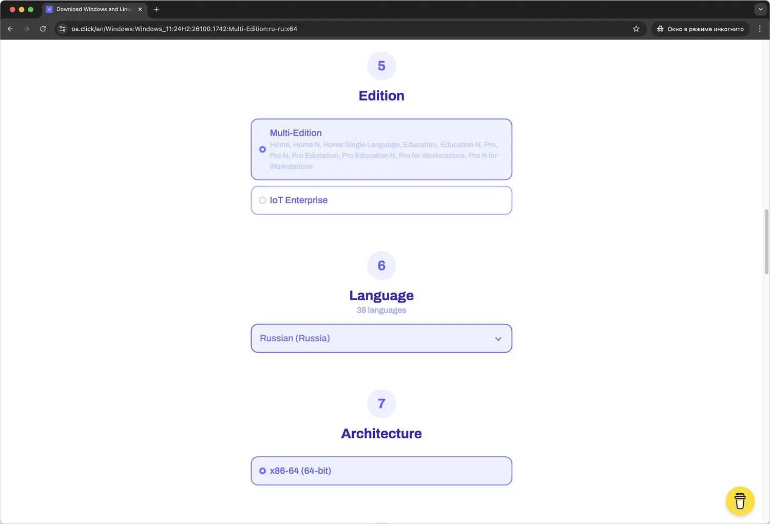 После этого выберите архитектуру — x86-64 (64-bit), 64-битную версию (для Windows 11 – единственная доступная на данный момент), так как большинство современных устройств поддерживают только её.