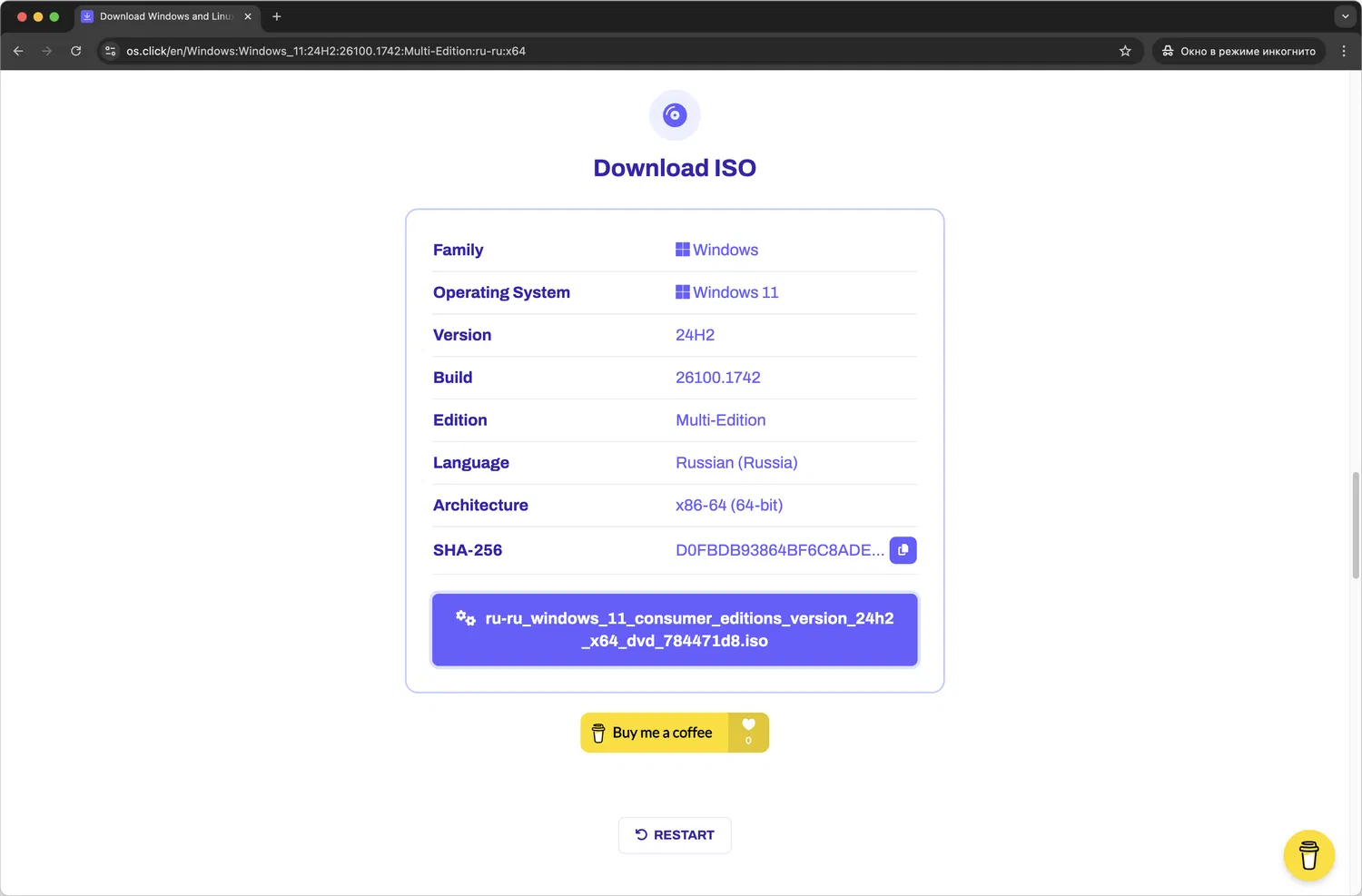 Все ISO-файлы, предоставленные через os.click, полностью безопасны и не содержат вирусов или вредоносного ПО. Для дистрибутивов Linux os.click просто предоставляет официальные ссылки, выпущенные издателями. В случае с Windows os.click размещает ISO-файлы, опубликованные Microsoft на MSDN (Microsoft Developer Network). Вы можете проверить целостность и подлинность каждого ISO-файла с помощью контрольных сумм sha1sum или sha256sum, которые будут точно соответствовать значениям, опубликованным Microsoft.