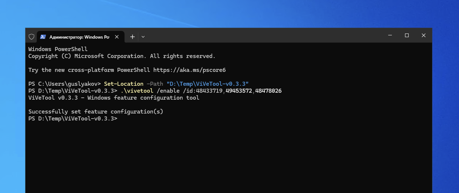 Примечание: В примерах используются команды в Терминале для профиля PowerShell . Если вы используете профиль Командная строка, замените начальную команду .\vivetool на vivetool.