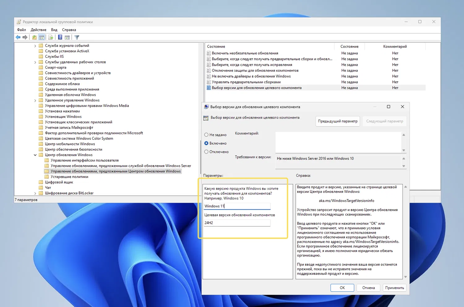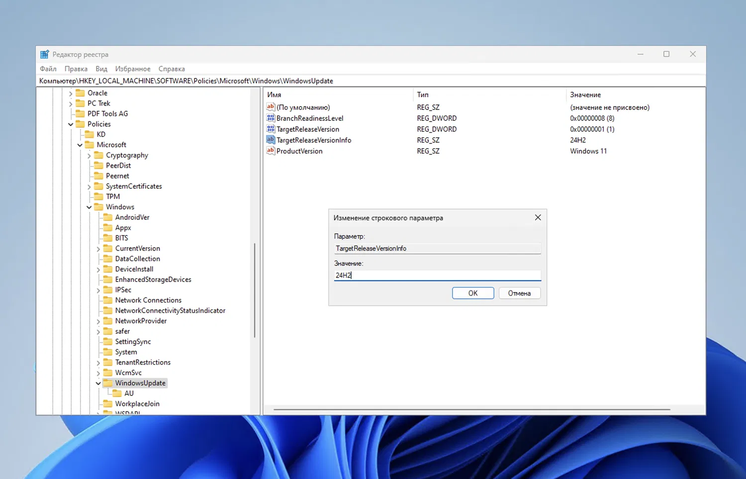 - Создайте строковый параметр TargetReleaseVersionInfo и установите значение 24H2