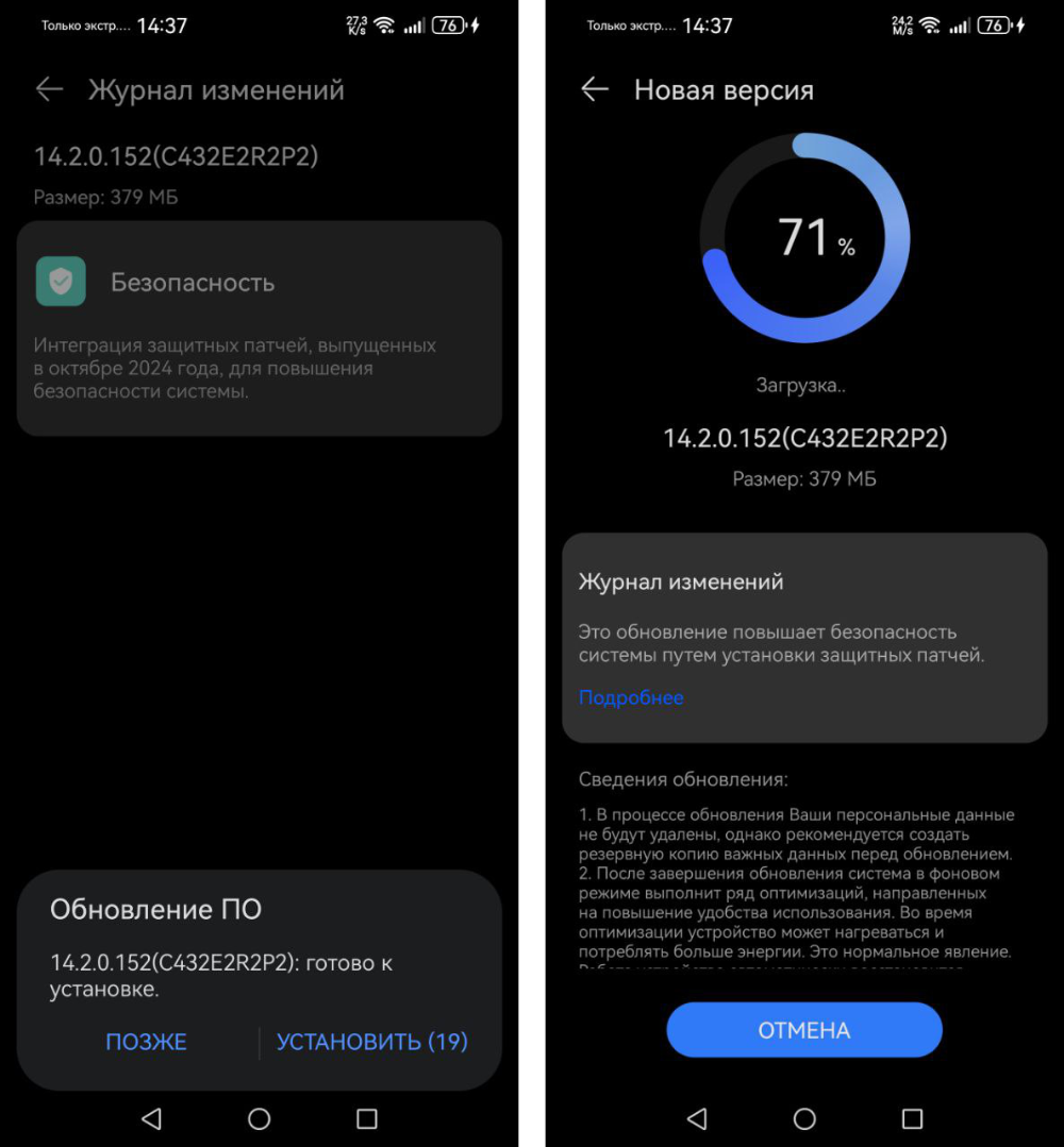 Владельцы смартфонов Huawei P60 Pro и Mate X3 могут идентифицировать октябрьское обновление по версии EMUI 14.2.0.152 и размеру пакета в 379 мегабайт.