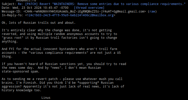 По информации Торвальдса, решение об отстранении было согласовано с юридическим отделом Linux Foundation и связано с расширением американских санкций против России от июня 2024 года, запрещающих предоставление определенных услуг в сфере программного обеспечения и IT на территории РФ с 12 сентября.