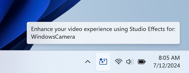 Новый значок Studio Effects, отображаемый в области уведомлений при использовании камеры с поддержкой Studio Effects