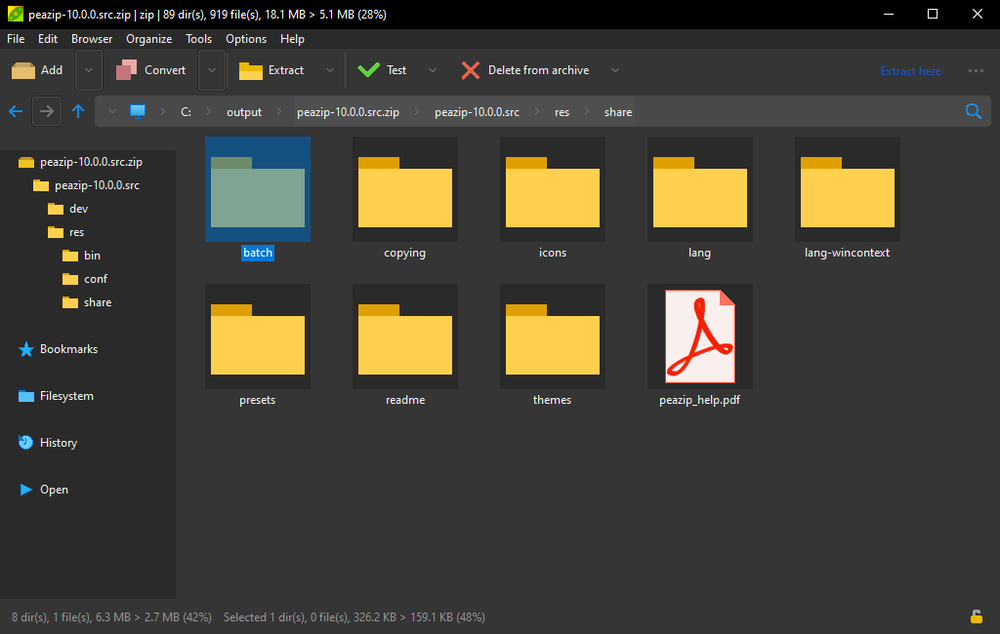 - Кроссплатформенность и портативность: PeaZip доступен для Linux, macOS и Windows, предлагая одинаковый интерфейс и функционал на всех платформах, а также поддерживает более 200 форматов архивов.