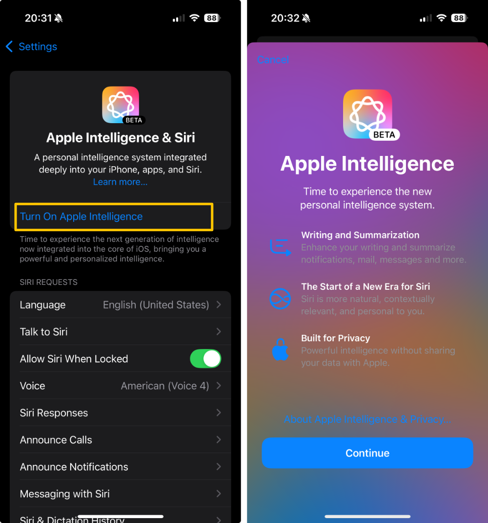 После одобрения заявки появится кнопка Turn On Apple Intelligence. Нажмите её для активации, и вскоре сможете пользоваться Apple Intelligence на своём устройстве.