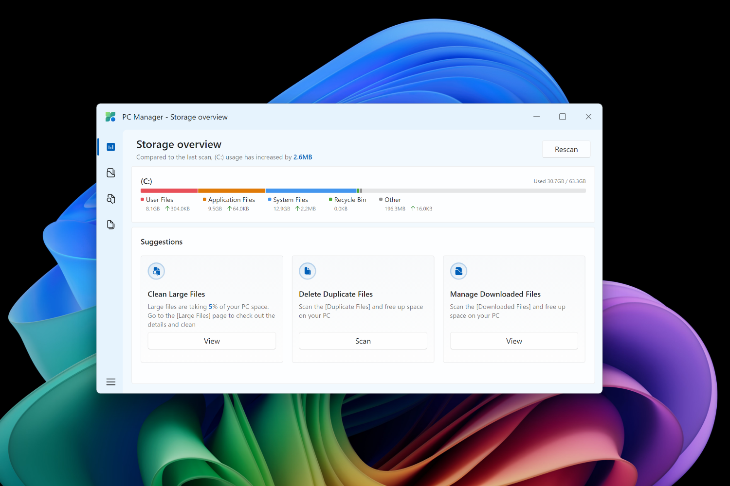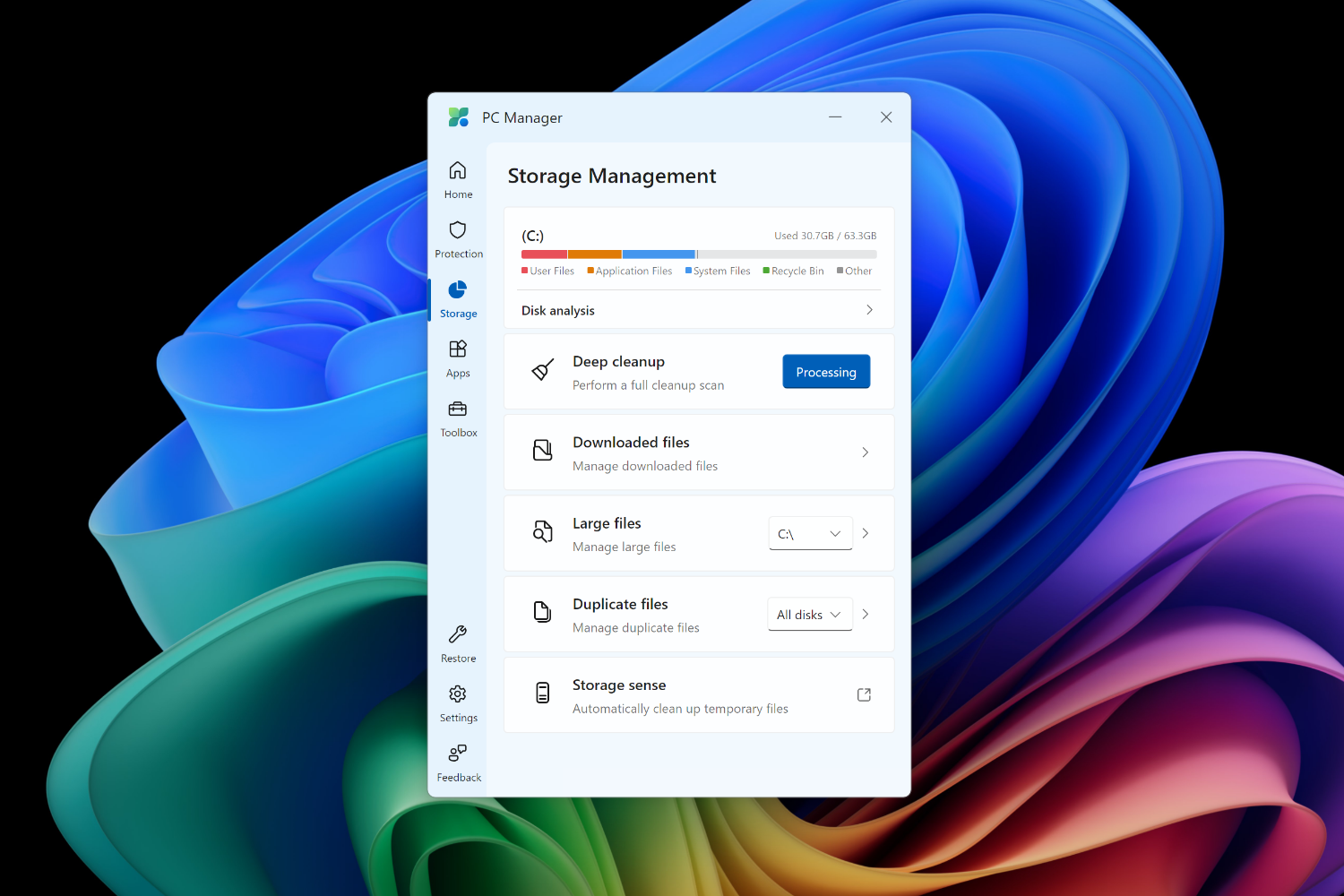 PC Manager теперь может быстро анализировать диск операционной системы, отображая использование пространства и предлагая рекомендации по управлению. Это поможет пользователям лучше понять, какие данные занимают место, и оптимизировать его использование.