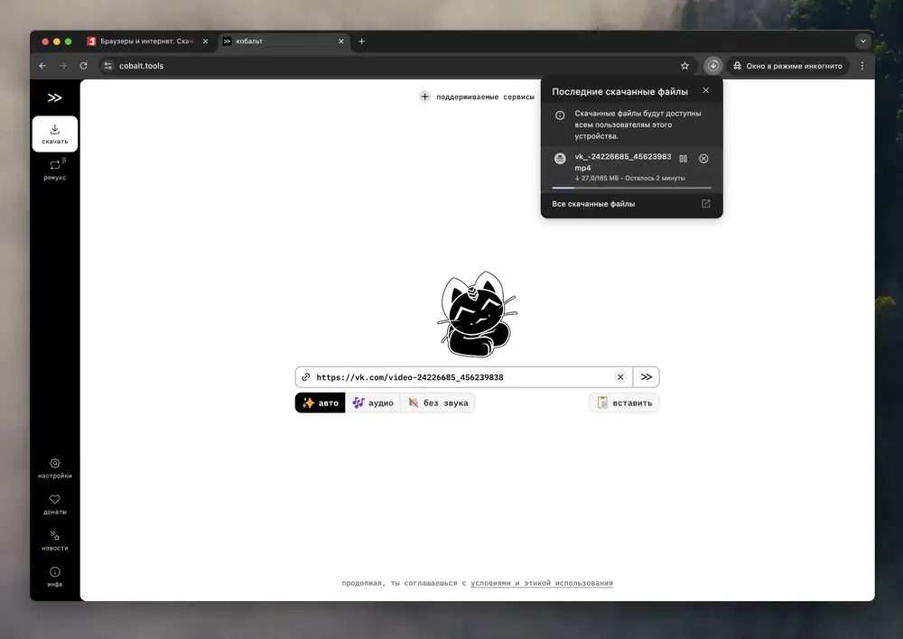Cobalt — это удобный загрузчик для видео и аудио с более чем десятка популярных сайтов. Это отличный выбор для тех, кто загружает видео изредка или сталкивается с проблемами при скачивании на других сервисах или с помощью других инструментов.