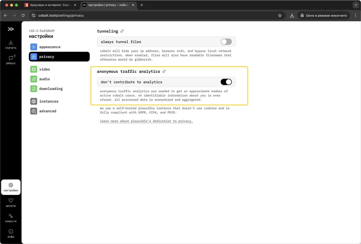Совет: Cobalt собирает анонимные аналитические данные о трафике, чтобы определить количество активных пользователей. Вы можете отключить эту функцию в Настройки > Privacy > anonymous traffic analytics, переведя переключатель don't contribute to analytics в активное состояние. Там же доступна опция для постоянного использования туннелирования файлов, которая скрывает ваш IP и другую информацию.