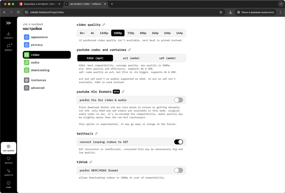 Для YouTube можно также изменить предпочитаемый кодек с h264 на av1 или vp9. В тестовом режиме доступна функция включения HLS для видео и аудио на YouTube.