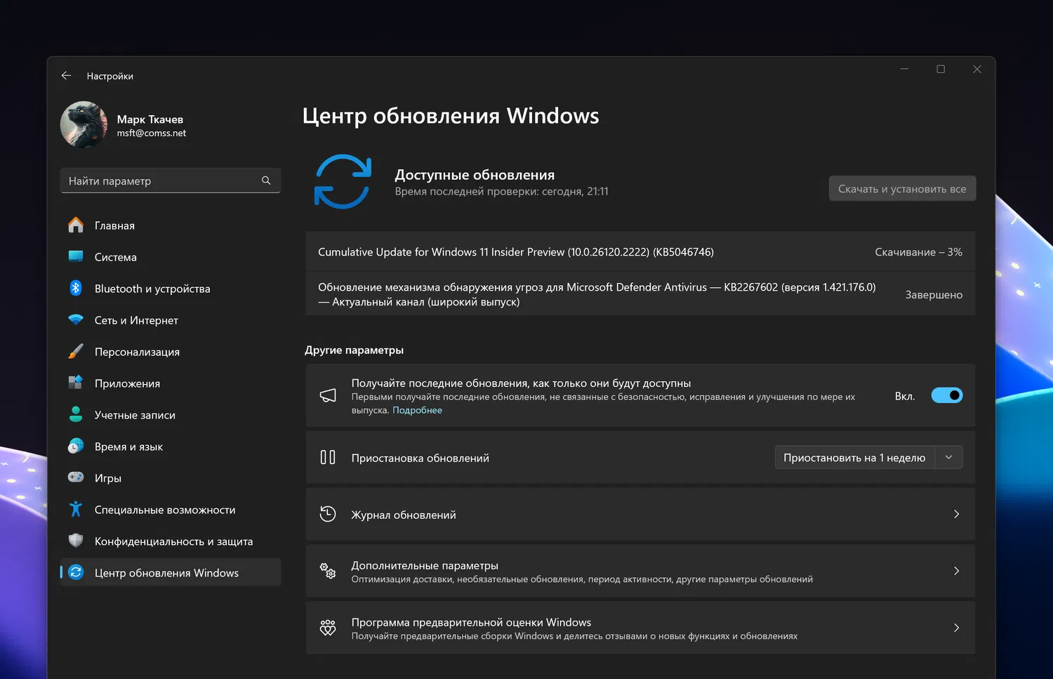Перейдите в меню Параметры > Центр обновления Windows и нажмите Проверить наличие обновлений. Для завершения установки потребуется перезагрузка компьютера.