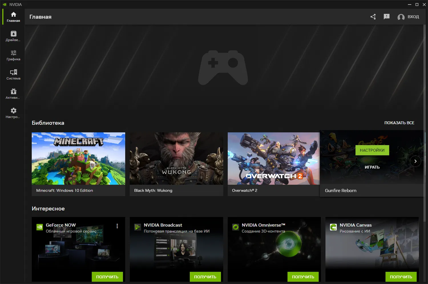 - Домашняя страница: первая страница приложения, на которой отображаются все ключевые элементы, доступные пользователю. Здесь можно быстро получить доступ к недавно открытым играм и приложениям, просмотреть последние новости и анонсы NVIDIA. Также доступен раздел «Библиотека», где можно открыть игры и приложения, а также оптимизировать их настройки с помощью рекомендаций NVIDIA.