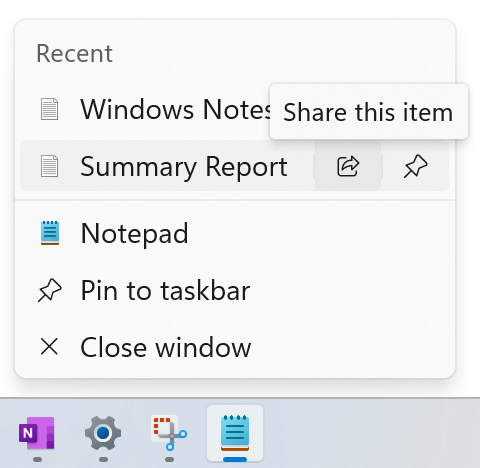 - Теперь можно делиться файлами прямо из Списка переходов (jump list) на панели задач, которые появляются при щелчке правой кнопкой мыши по приложениям, таким как Блокнот, закрепленным на панели задач.
