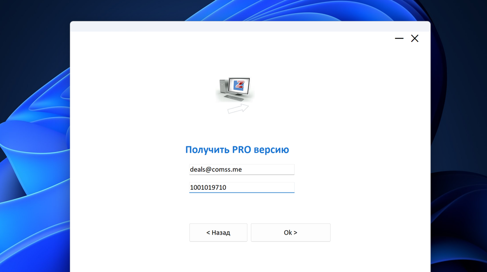 - Укажите ваш адрес электронной почты и нажмите ОК. Вы получите электронное письмо с номером лицензии в течение 2 минут.