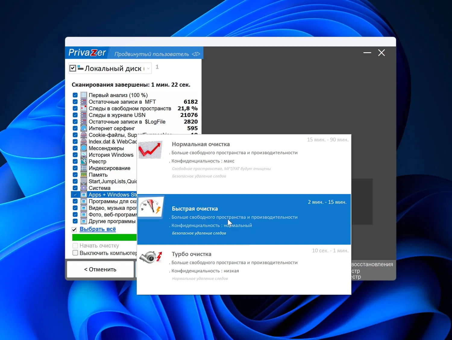 - Глубокая очистка системы: удаление временных файлов, кэша, истории браузера, остаточных записей реестра и других ненужных данных, что способствует повышению производительности компьютера.