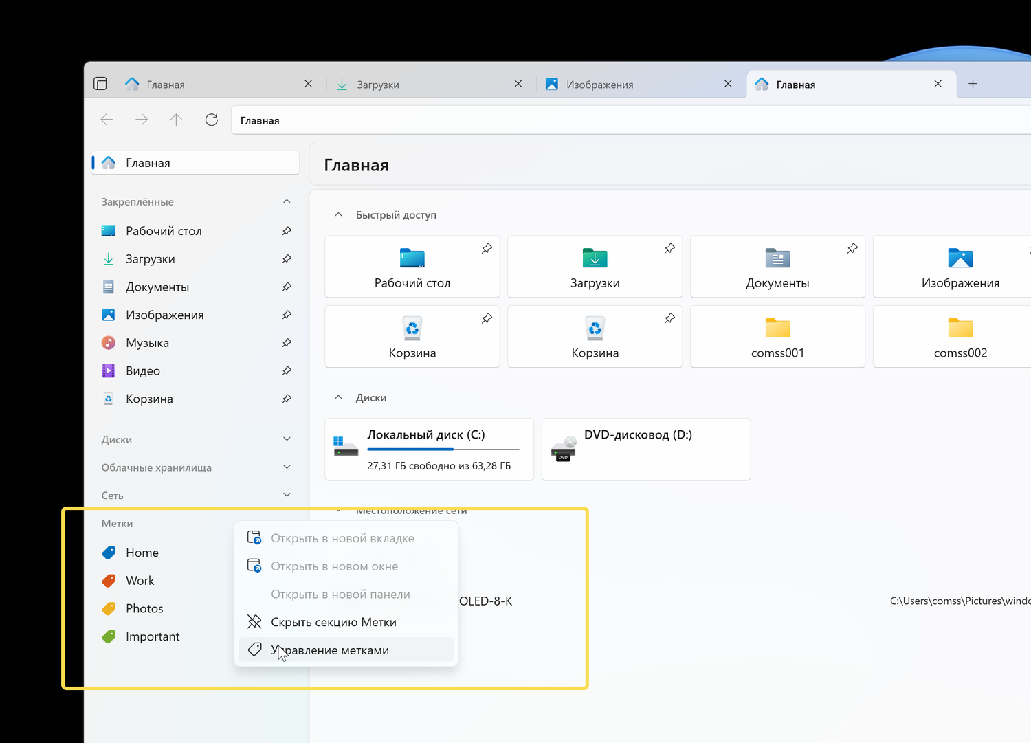 - Управление метками из боковой панели: Теперь можно управлять метками прямо из боковой панели. Для этого достаточно нажать правой кнопкой мыши на разделе Метки и выбрать опцию «Управление метками», чтобы создать, удалить или отредактировать их.