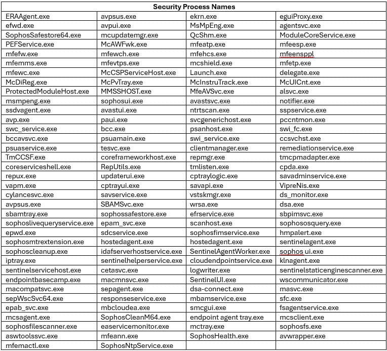 Вредоносное ПО атакует процессы из различных решений безопасности, включая McAfee, Symantec (Broadcom), Sophos, Avast, Trend Micro, Microsoft Defender, SentinelOne, ESET и BlackBerry.