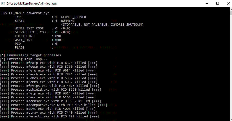 Они объясняют, что вредоносная программа с именем файла kill-floor.exe помещает уязвимый драйвер с именем файла ntfs.bin в папку пользователя Windows по умолчанию. После чего угроза создает службу aswArPot.sys с помощью Service Control (sc.exe) и регистрирует драйвер.