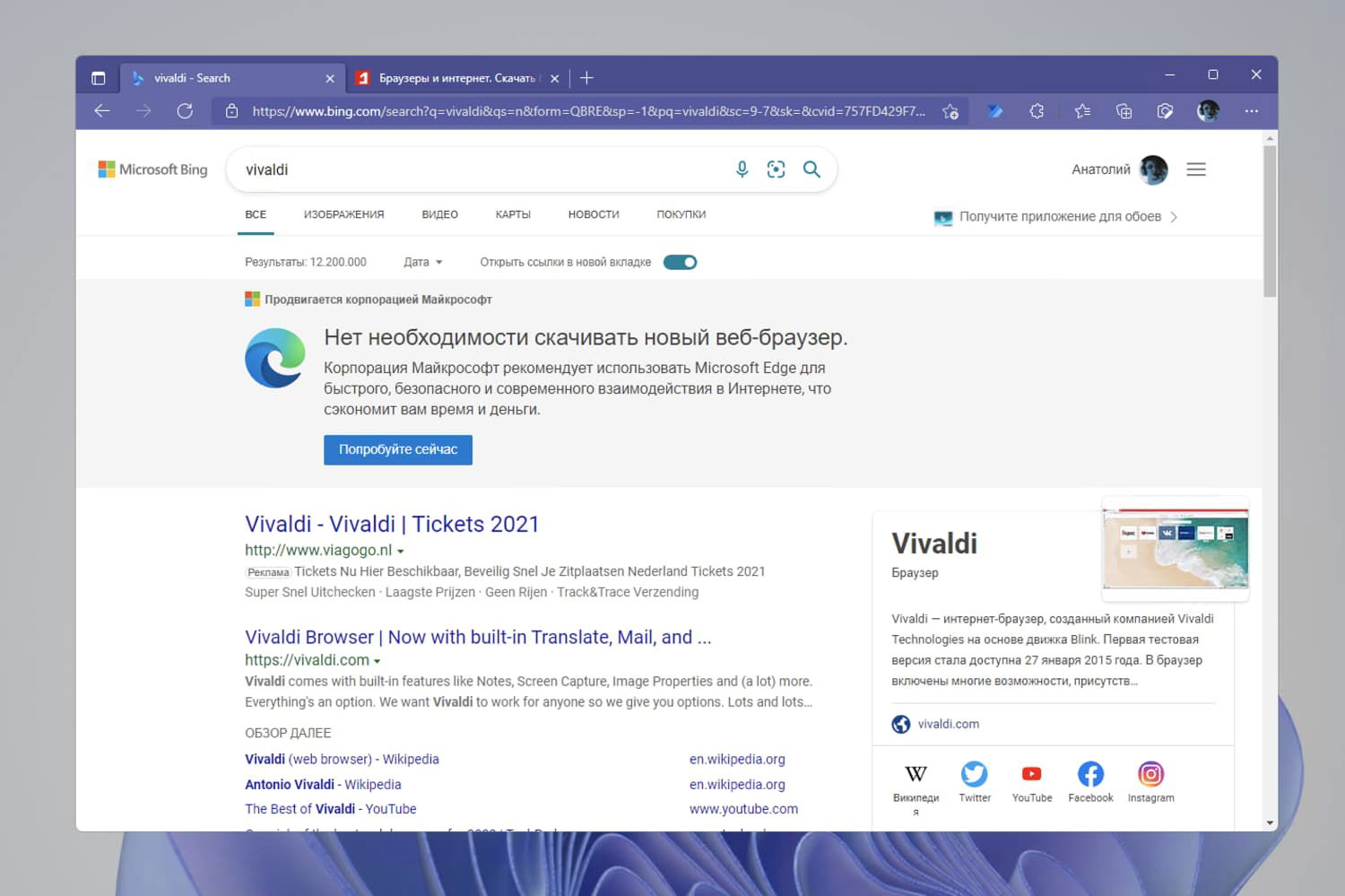 Тестирование поисковых запросов в Bing показало, что баннеры, продвигающие Edge, не отображаются для Vivaldi, Opera, Waterfox и Wavebox. Однако, при поиске Google Chrome, Firefox и Arc Browser появилось сообщение «Нет необходимости загружать новый браузер».