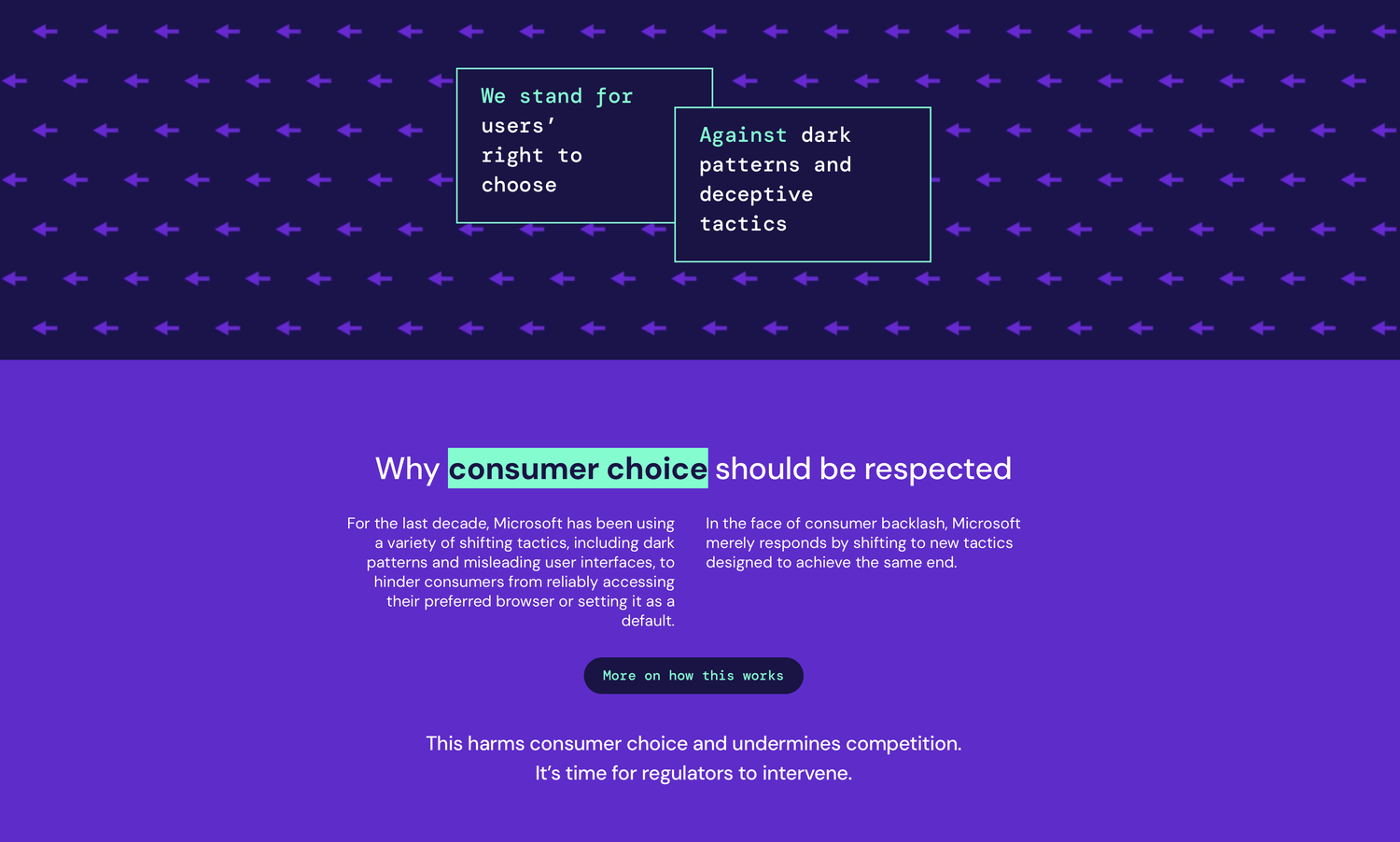 Согласно данным StatCounter, Windows используется более чем на 73% компьютеров в мире. Участники альянса обвиняют Microsoft в создании «темных паттернов», технических барьеров и обманных приемов, чтобы усложнить установку браузеров третьих сторон в качестве браузера по умолчанию на устройствах с Windows.