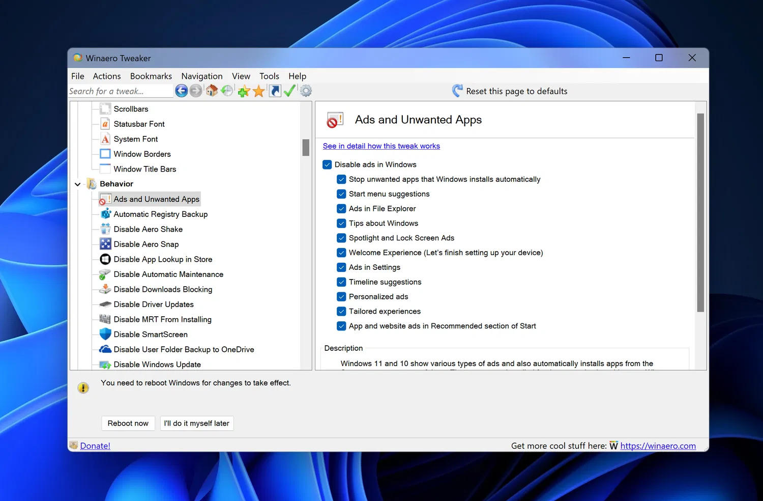 Если вы хотите избавиться от большинства объявлений, вы можете использовать такой инструмент, как Winaero Tweaker. Утилита является бесплатной и охватывает многие большинство рекламных блоков в системе Разберем, как использовать программу.