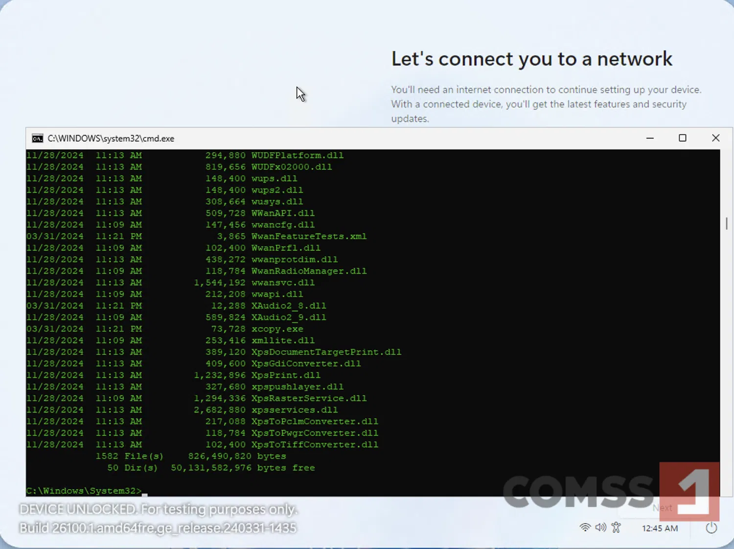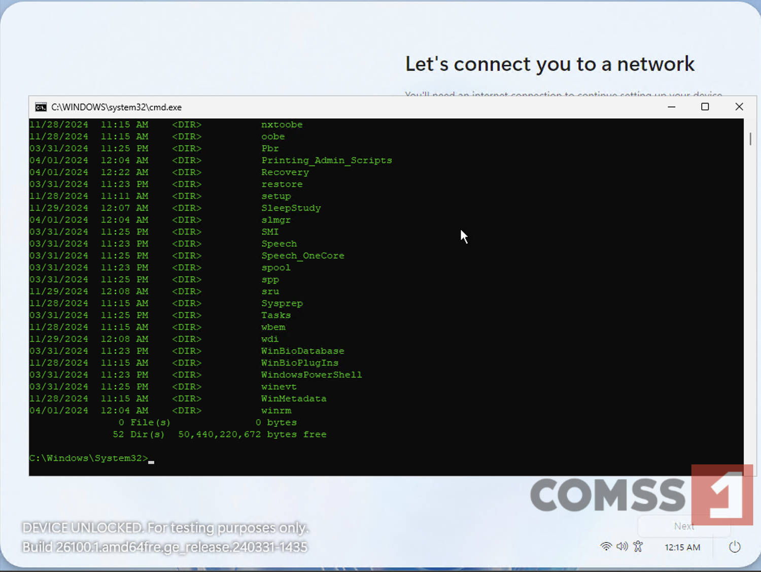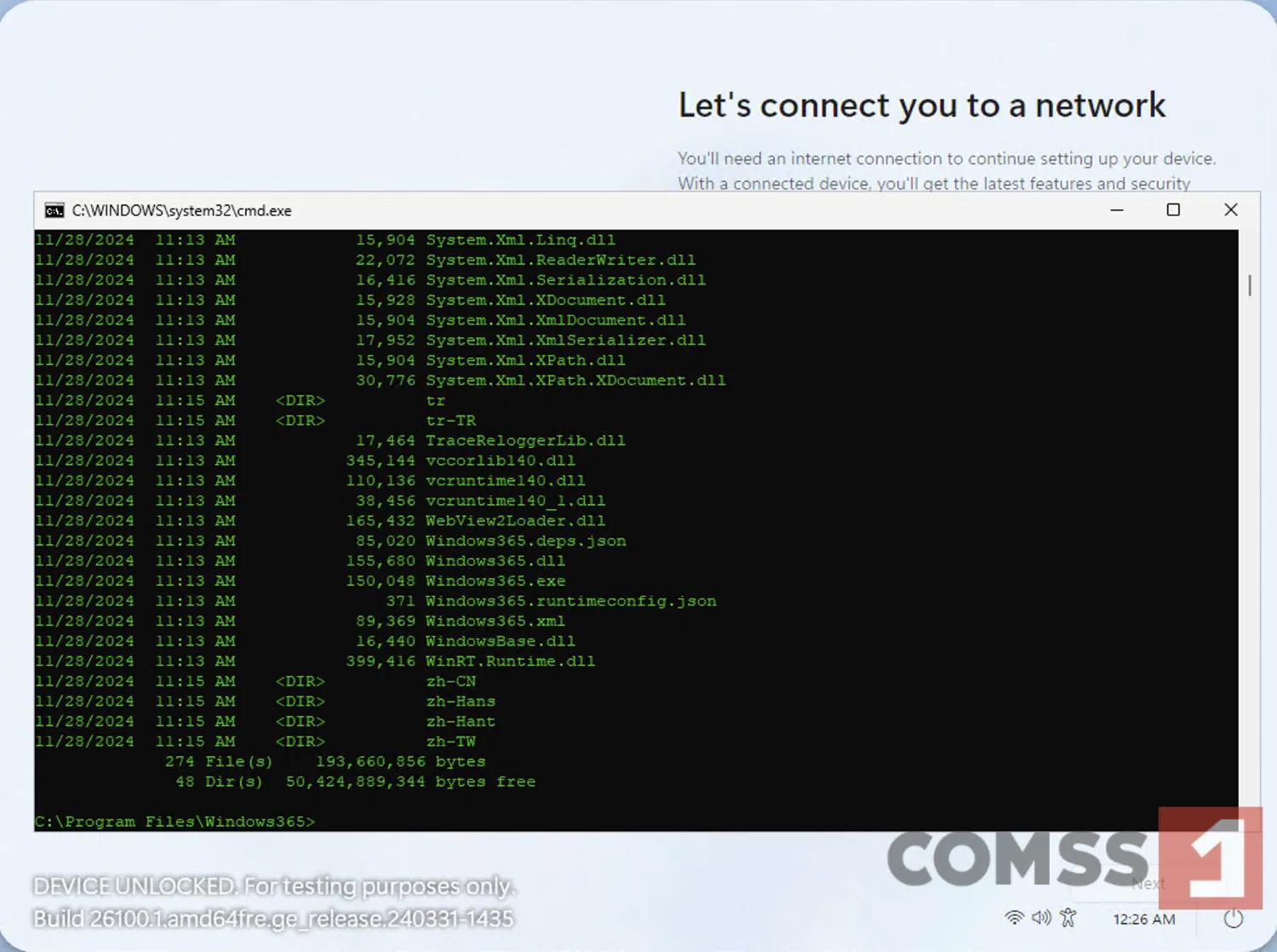 Вместо привычного интерфейса настройки OOBE пользователь попадает на экран подключения к Wi-Fi, а затем на страницу входа в облачный ПК Windows 365. Продолжить установку без учётной записи Microsoft невозможно. Однако с помощью сочетания клавиш Shift + F10 можно открыть «Командную строку» и изучить файловую структуру системы.