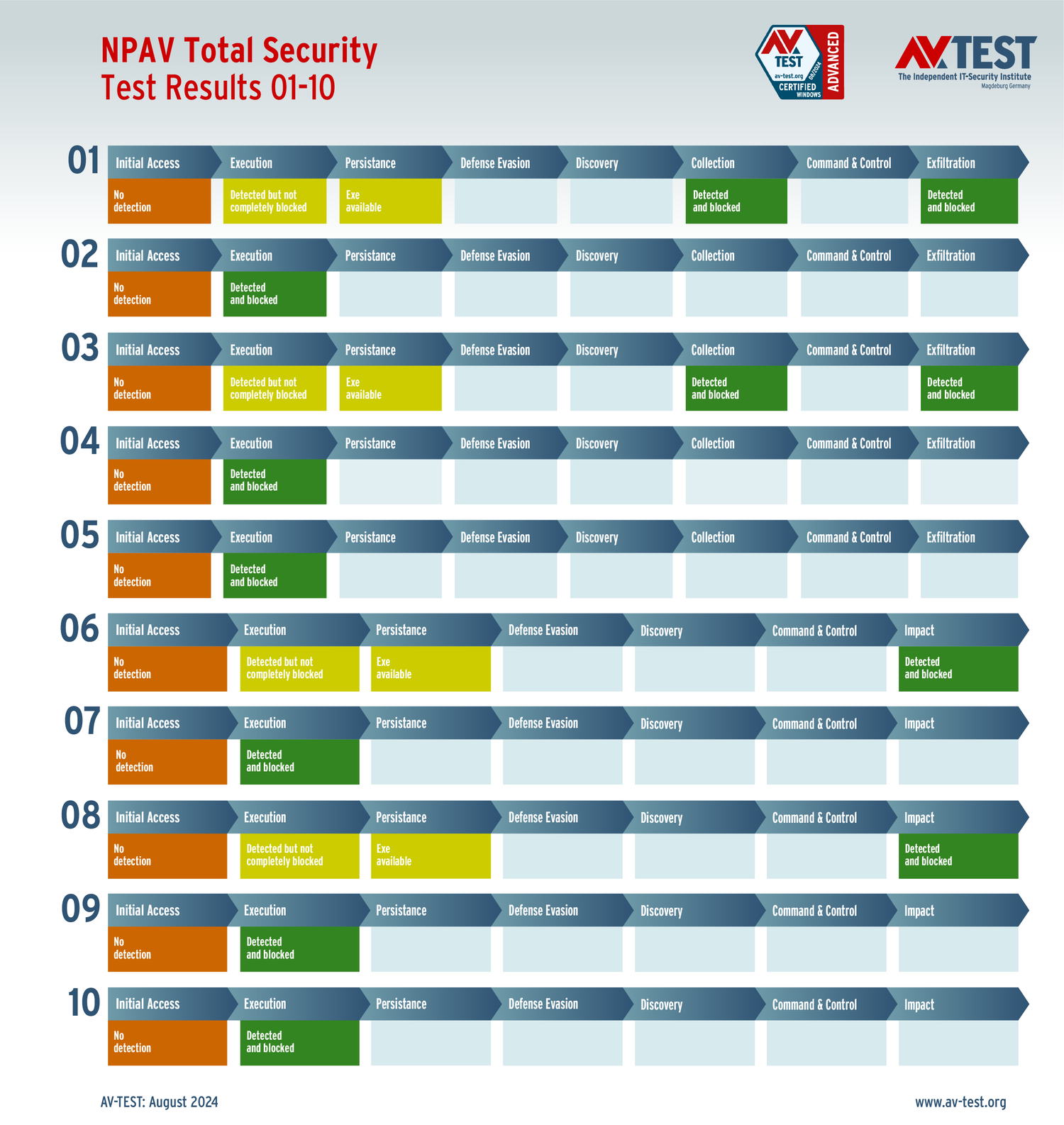 Антивирус NPAV выявил атаки во всех 10 сценариях, но в четырех случаях не смог сразу остановить атаки. Лишь с помощью дополнительных модулей защиты удалось предотвратить их завершение, однако исполняемые файлы злоумышленников остались в системе. За эти ошибки были вычтены баллы, в результате чего NPAV получил 31 из 35 возможных баллов.